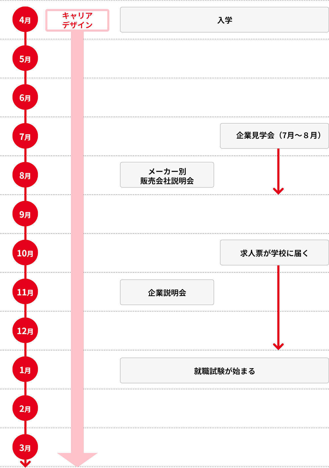 入学式翌日から毎週行う「キャリアデザイン」授業で、自己分析からビジネスマナー、業界研究、面接指導などを実施。学生一人ひとりが自分の進路を自分で考え、判断できるようにサポートしていきます。毎週1コマ授業として組み込み、段階的に就職サポートを行っています。